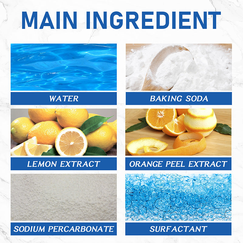 Hauptbestandteile: Wasser, Backsoda, Zitronenextrakt, Orangenschalenextrakt, Natriumpercarbonat, Tenside