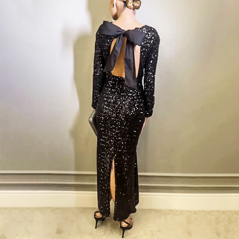 Pailletten-Maxikleid mit Schleife und rückenfreiem Schlitz