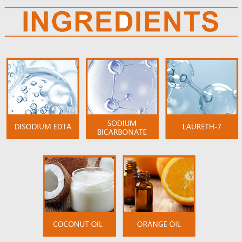Wichtigste Inhaltsstoffe: Kokosnussöl, EDTA Disodium, Natriumbicarbonat, Laurylether-7 (Reinigungsmittel), Orangenöl